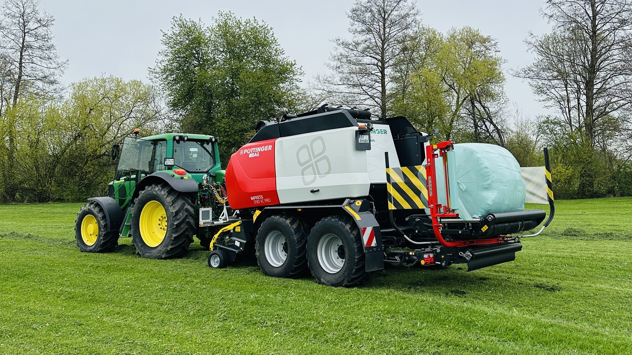 Wir pressen Rundballen mit einer Pöttinger Impress 3190 VC PRO (Wickel-Kombination) mit bis zu 32 Messern und einer Variablen Größe von 0,90m bis zu 1,85m.
